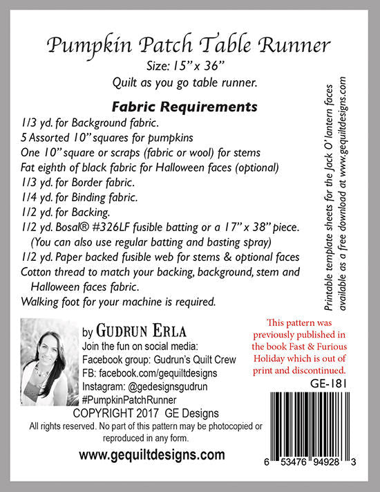 A quilt as you go Table runner pattern using 10" squares and made with a Quilt As You Go method. The templates for the optional Jack-o-lantern fusible appliques can be downloaded and found on the Free Patterns and Templates tab. Size 15" x 36".