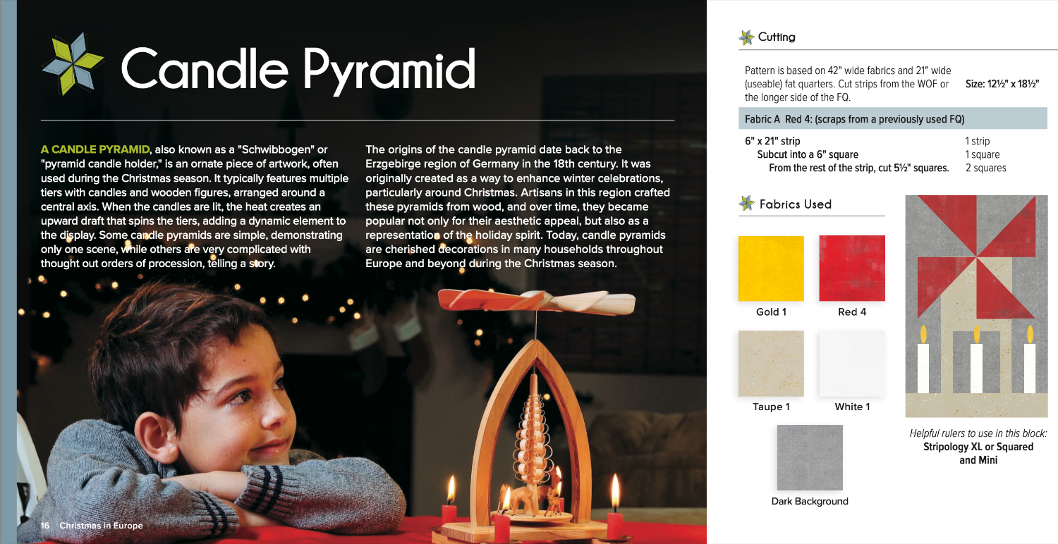 Each quilt block is inspired by a beloved holiday custom from across Europe, with rich backstories and festive flair. You’ll discover 13 quilt blocks and 4 bonus projects, plus traditional European recipes that make this a perfect creative keepsake—or coffee table favorite—during the holidays.